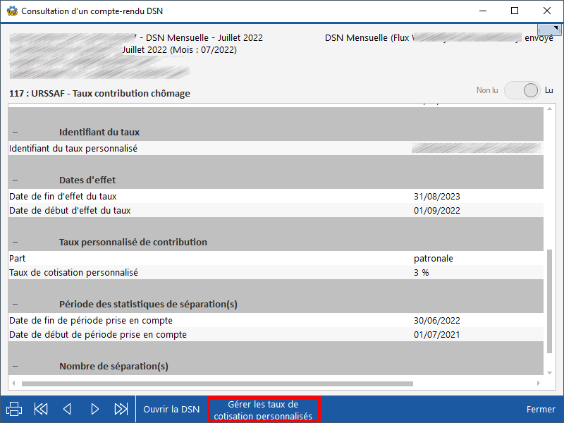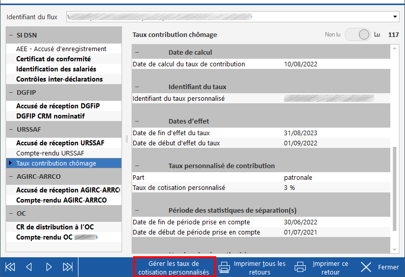 En consultation des CRM d'une DSN, après avoir sélectionné le CRM Taux contribution chômage, via le bouton Gérer les taux de cotisation personnalisés.