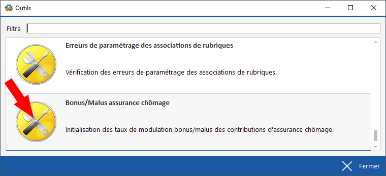 Via le menu Outils - Autres outils - Lancer un autre outil , en cliquant sur l'icône de l'outil Bonus/Malus assurance chômage (à ce jour, dernier outil en bas de la liste).