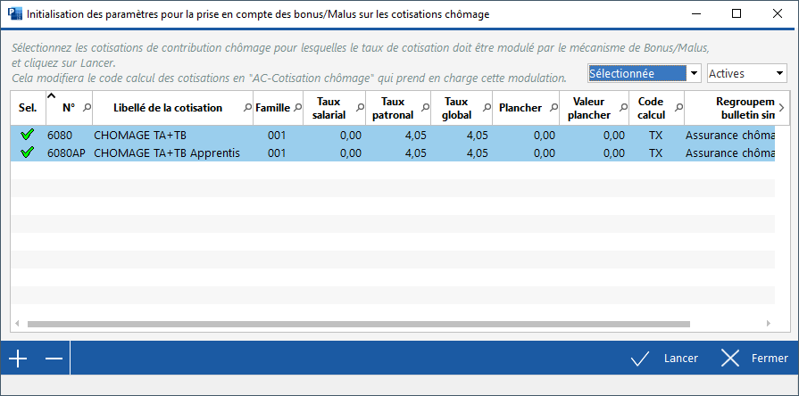 Sur le deuxième, il convient de contrôler que les cotisations présélectionnées correspondent bien aux cotisations d'assurance chômage, celles ayant le taux patronal de 4,05 :