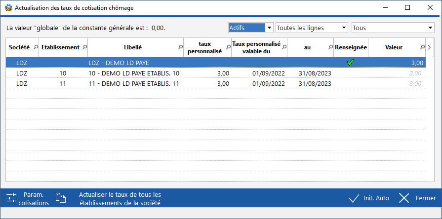 Pour désactiver le taux inscrit, il suffit de décocher la colonne Renseignée. ATTN : remettre à 0 ne suffit pas. Si la colonne Renseignée est cochée mais que le taux n'est indiqué, la cotisation serait alors calculée avec un taux à 0. Ce serait une erreur.