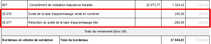Le montant total du bordereau de versement (URSSAF ou MSA) doit correspondre au montant présent sur l'état de cotisations (URSSAF ou MSA) + le solde de la taxe d'apprentissage - la déduction liée à des subventions - la déduction liée à des créances alternants.