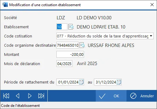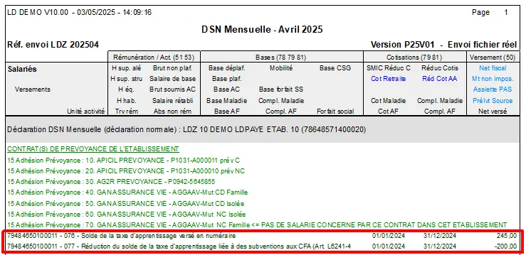 Au niveau de l'état de contrôle DSN, il convient de vérifier la présence de l'ensemble des cotisations établissements saisies (076 - Solde de la taxe d'apprentissage versé en numéraireou 077 - Réduction du versement libératoire de la taxe d'apprentissage liée à des subventions aux CFA ou 078 - Réduction du versement libératoire de la taxe d'apprentissage liée à des créances alternants).