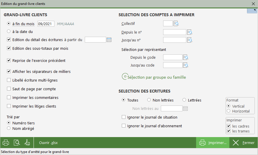 Cette procédure permet d'éditer les grands-livres clients, fournisseurs et autres auxiliaires. Elle est accessible depuis les options de menu Édition/Grands-livres/Clients, Édition/Grands-livres/Fournisseurs, Édition/Grands-livres/Autres auxiliaires.