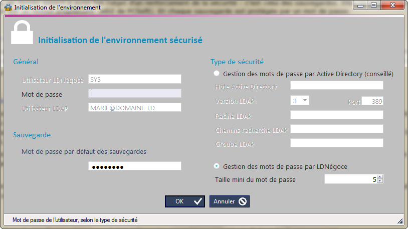 Enfin, en partie droite de cette fenêtre, il faut choisir en une sécurisation faite via Active Directory, le gestionnaire des utilisateurs au sein d'un domaine Windows, ou par simple contrôle d'un mot de passe interne à LDNégoce.