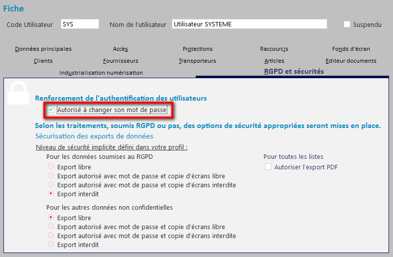 Il existe toutefois une possibilité, pour un administrateur, d'interdire à certains utilisateurs la modification de leur propre mot de passe. Cela se fait en allant décocher, dans la fiche de chaque utilisateur, l'option Autorisé à changer son mot de passe. Cette méthode peut être mise en œuvre si l'administrateur souhaite imposer des règles de gestion de mot de passe plus strictes qu'une simple longueur minimale : par exemple, un mélange de caractères minuscules et majuscules, de chiffres voire même de caractères spéciaux. L'administrateur choisit donc lui-même les mots de passe et a la garantie que l'utilisateur ne pourra remplacer ce mot de passe « complexe » au profit d'un mot de passe plus simple qui serait trop facile à retrouver.