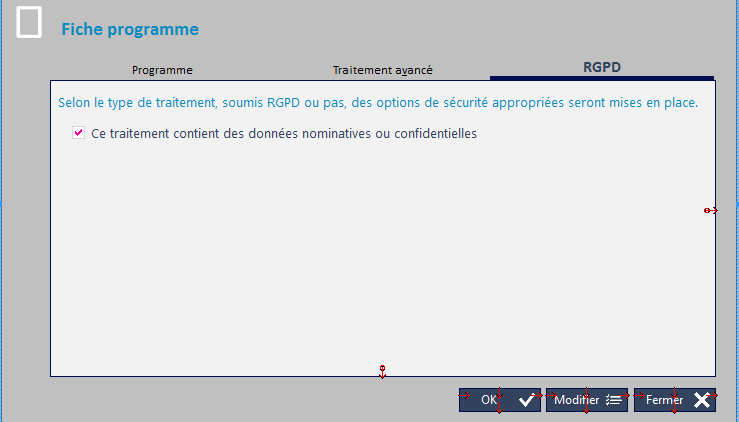 Tous les états et fenêtres du logiciel ont été classés en 2 familles : ceux qui contiennent des données personnelles, dites données RGPD, et ceux qui n'en contiennent pas. Par exemple, toutes les fenêtres présentant des données nominatives (nom des tiers, représentants) sont classées dans la première famille, alors que celles présentant les données articles (dépôts, familles de produits, ...) sont dans la deuxième.