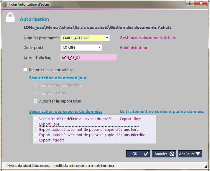 On peut éventuellement changer le niveau de sécurité pour une fenêtre ou un état. On passe alors par la gestion des autorisations pour le couple Programme/Profil, et on remplace la valeur implicite par la nouvelle option d'export choisie :