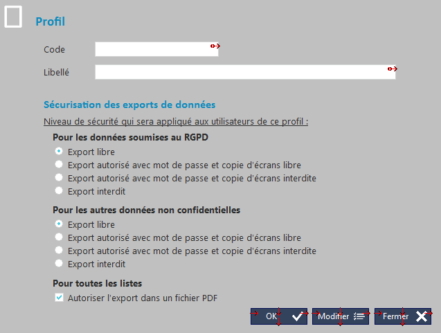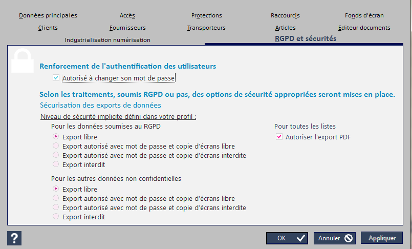 Il vous appartient d'ouvrir davantage les fonctions d'export de données RGPD si vous estimez que cela est indispensable pour travailler correctement. Mais il sera alors souhaitable de le préciser dans la fiche d'activité de registre de LDNégoce, en précisant qui est autorisé à pratiquer ces exports et dans quel but.