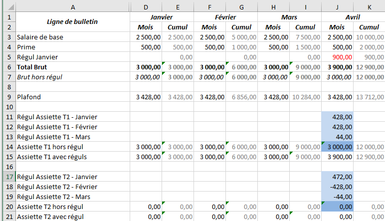 Nous avons ici le cas d'un salarié ayant un brut de 3000€ sur janvier, février et mars. En avril, on conserve ce brut de 3000€ mais on y ajoute une régularisation de 900€ à faire au titre de janvier (celle qui apparaît en J5).