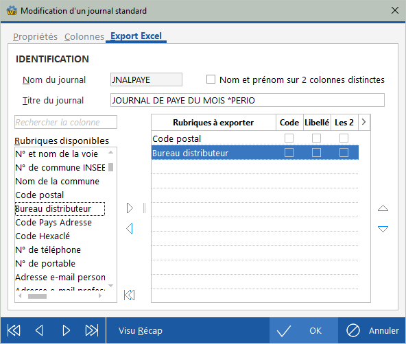 Pour ce qui est des journaux standards et détaillés, en sus des colonnes prévues en standard et qui correspondent à peu de chose près à ce qu'on trouverait sur l'état si on en demandait l'impression, on peut ajouter des colonnes supplémentaires issues de la table des salariés. Cela se configure dans la définition du journal (standard ou détaillé), sur l'onglet Export Excel.