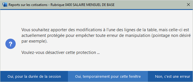 Pour y remédier, une protection est présente dans toutes ces fenêtres de pointage : lors de la première tentative de modification sur une fenêtre quelconque de ce type, un avertissement du même type que celui présenté ci-dessous vous sera présenté :