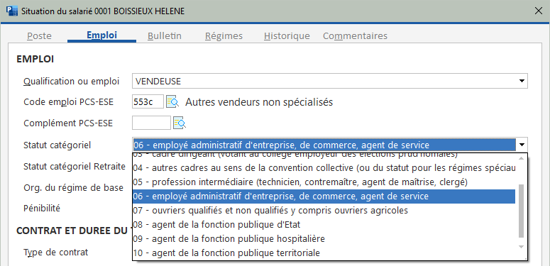 Exemple ici avec le statut conventionnel d'un salarié, déclaré en rubrique 002 du bloc 40-Contrat :