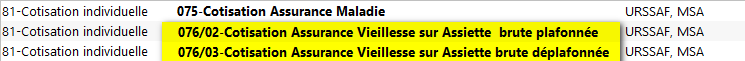 On retrouve ce même principe pour la cotisation Assurance Vieillesse où l'on a deux paramètres : 076/02-Cotisation Assurance Vieillesse sur Assiette brute plafonnée et 076/03-Cotisation Assurance Vieillesse sur Assiette brute déplafonnée.